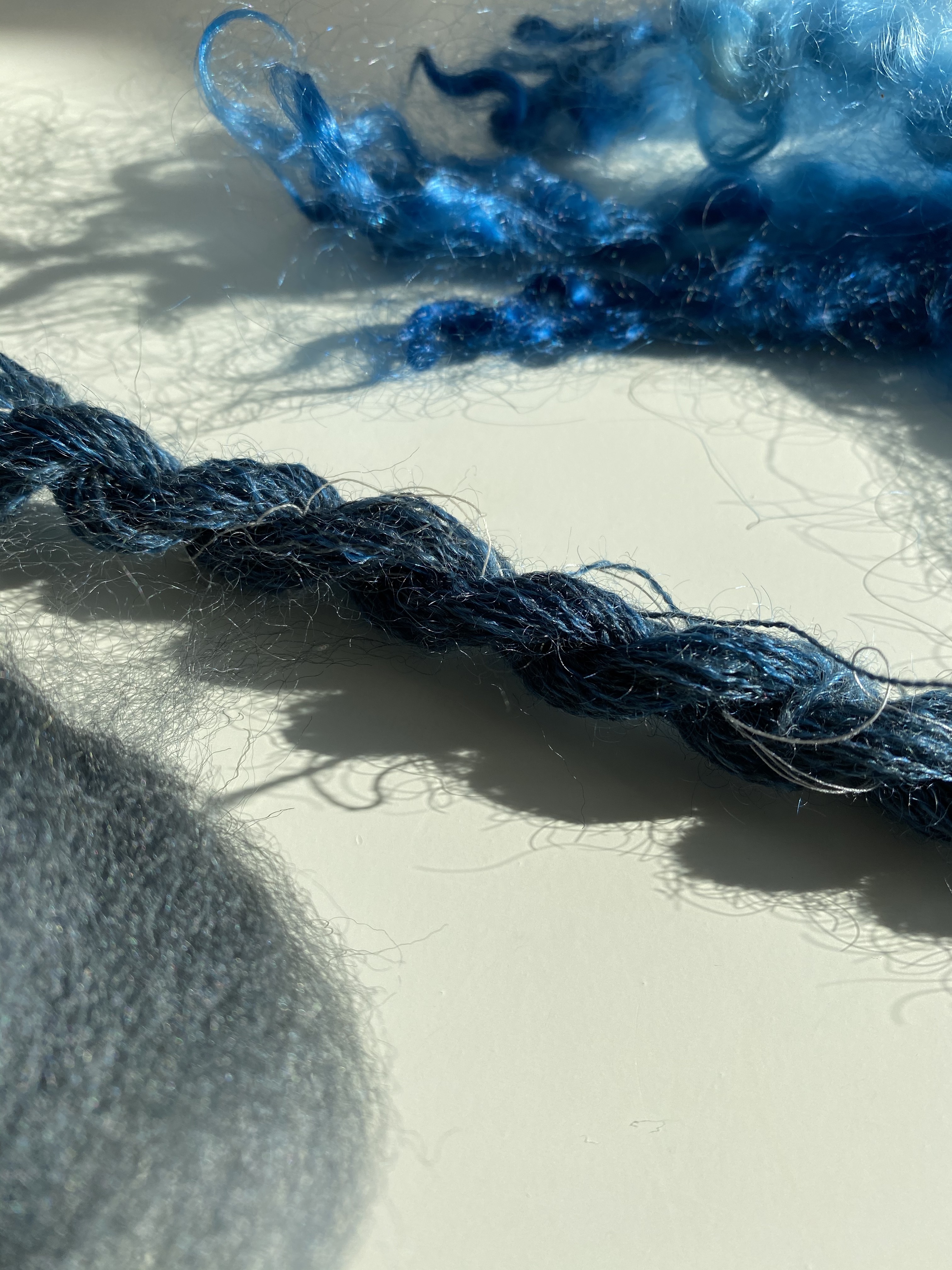 Mohair is a unique fibre whose properties I explored in this study. Exploring fibre preparation and spinning methods I designed adult and kid mohair yarns as well as wool blends. The final yarns were used in both knit and woven (warp and weft) textiles as well as for surface embroidery.